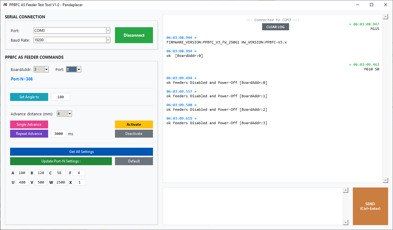 The new PPBFC_AS_Feeder_Test_Tool utility program can assist in sending the mentioned commands. The program connects to the feeder controllers independently via the serial port. Before connecting, it is necessary to disconnect the OpenPnP first to release the serial port.