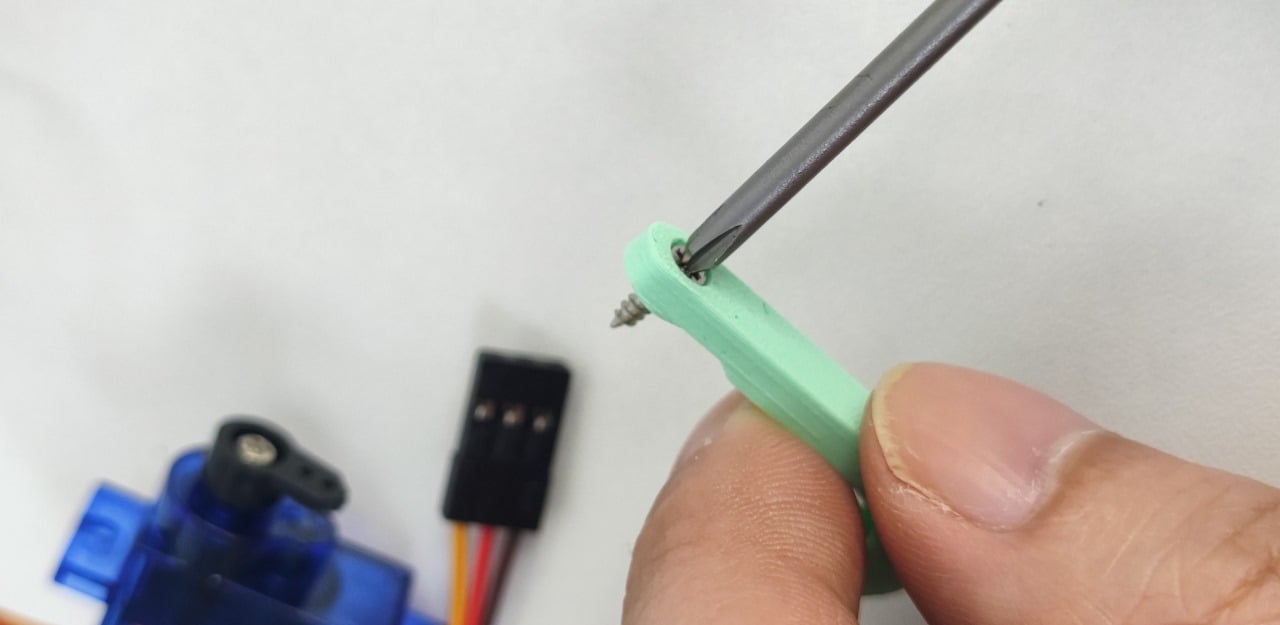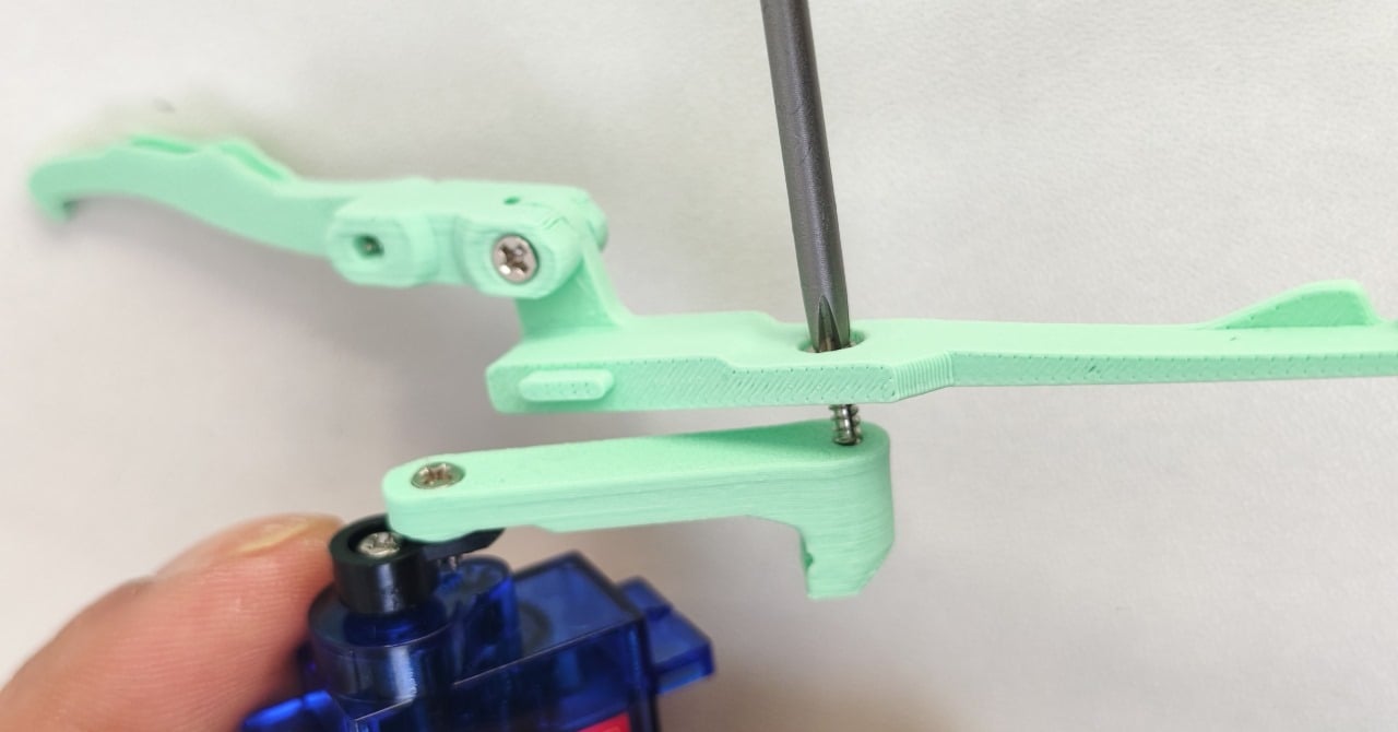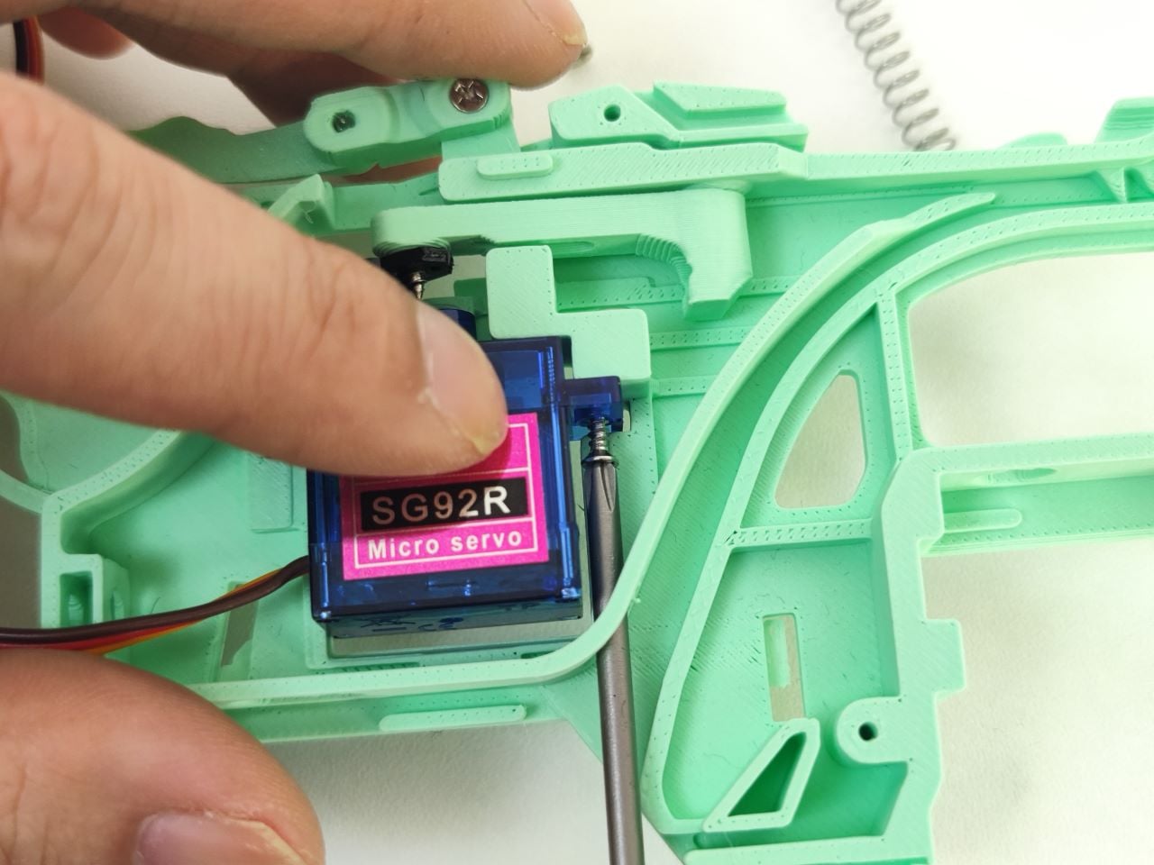 Secure the servo using two M2x8 screws. The screws must be installed from the bottom upward, with the screwdriver passing through the two reserved mounting holes.
