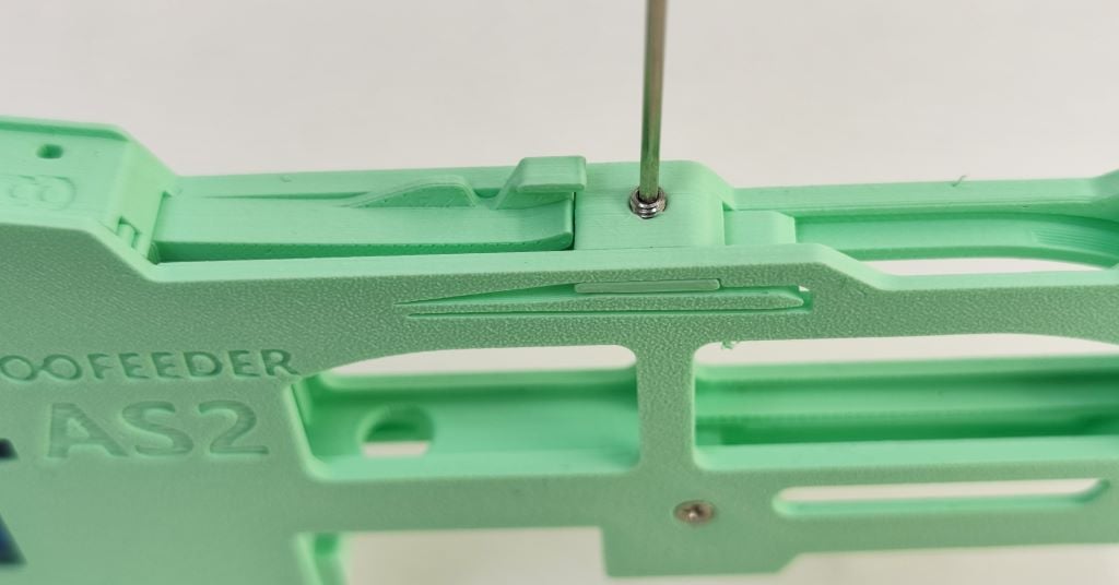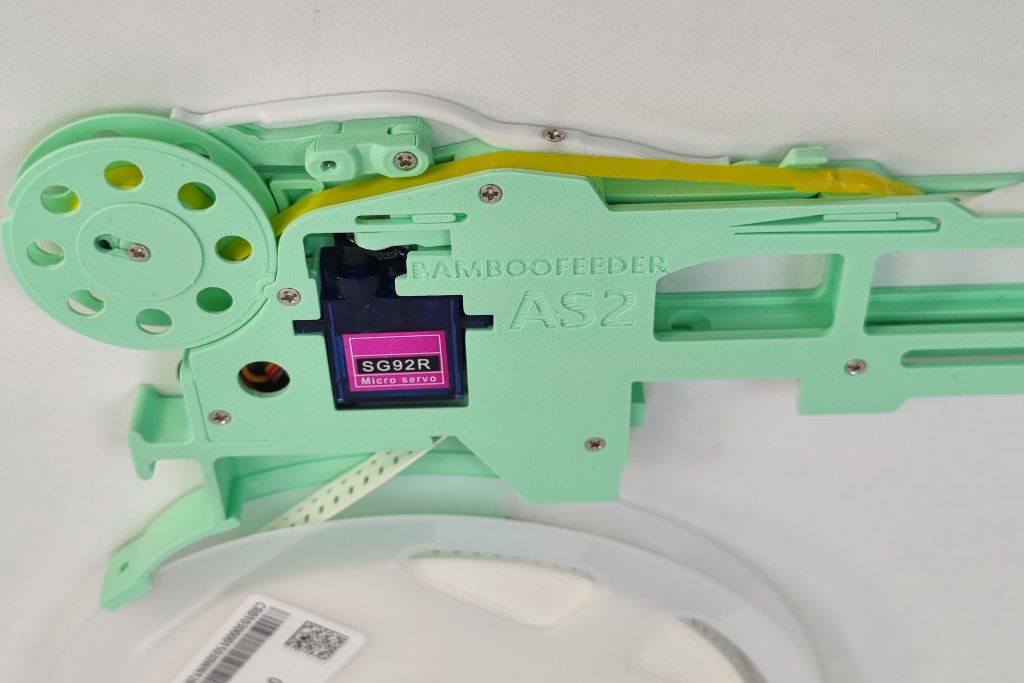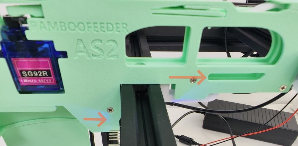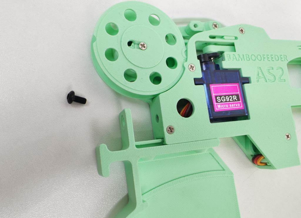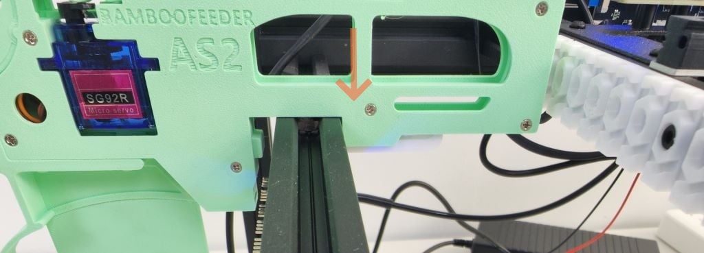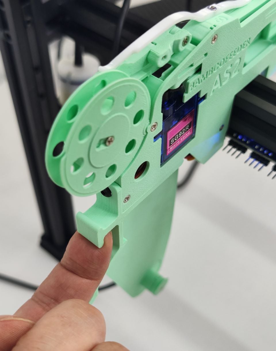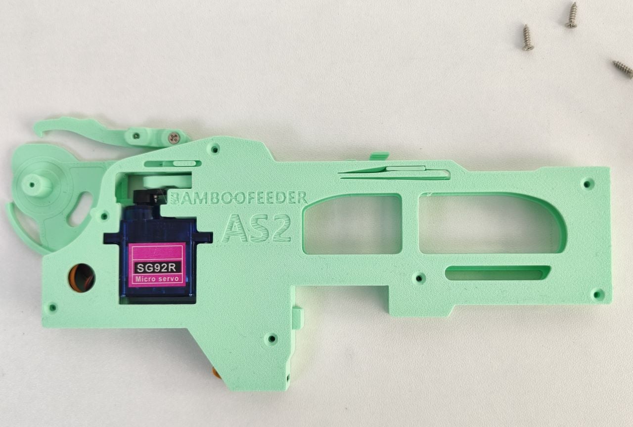 Then gently push the feeder forward, the servo connector at the bottom of AS2 will automatically connect to the controller's pins, and the front end of AS2 will engage with the front positioning block.