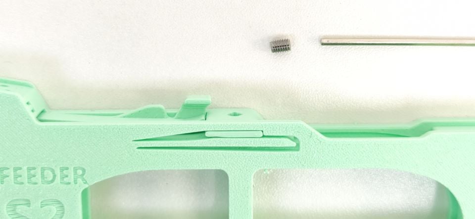 First, insert one end of the spring into the groove on the Advancer. Then, compress the spring using your fingers or a flathead screwdriver, and insert the other end of the spring into the groove on the Base.