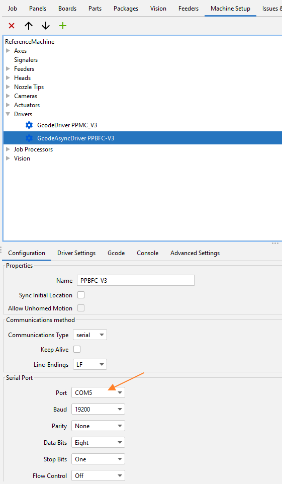 Feeder Controllers serial port: Machine Setup > Drivers > PPBFC-V3