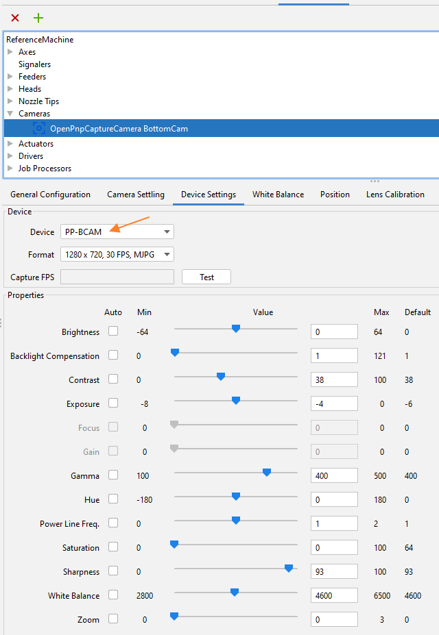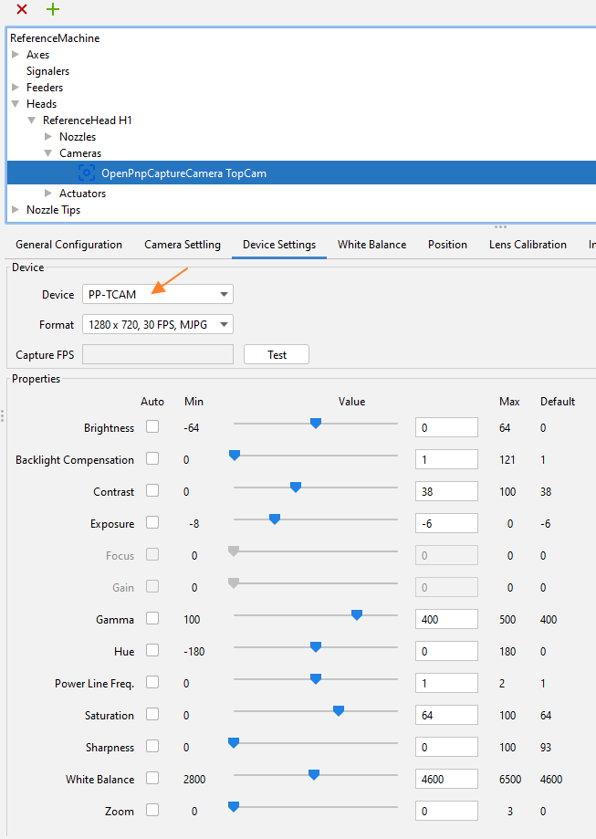 Menu: Machine Setup > Heads > ReferenceHead H1 > Cameras > TopCam