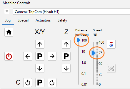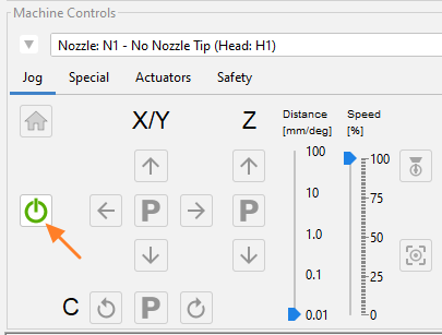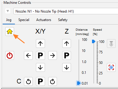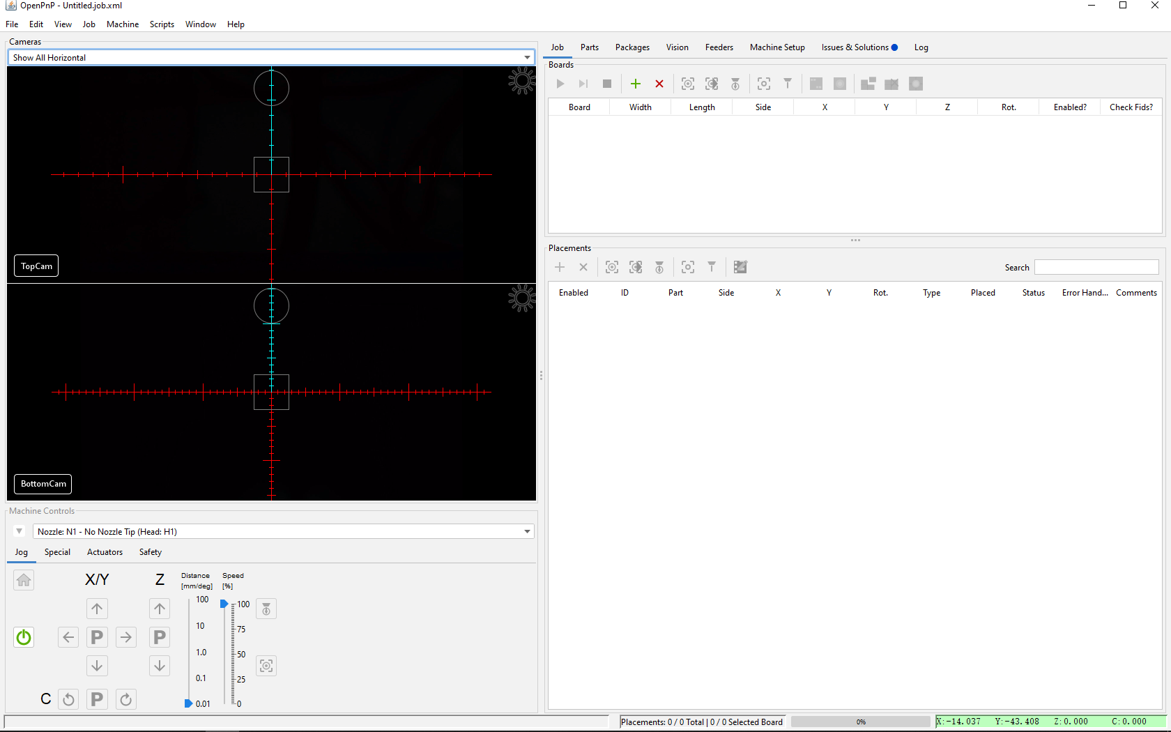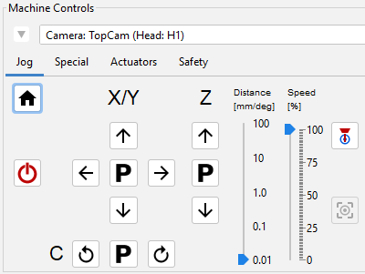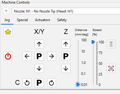 - Ctrl+Arrow Key: Jog the currently selected Nozzle in X and Y. Up and Down arrows jog in Y and Left and Right arrows jog in X.