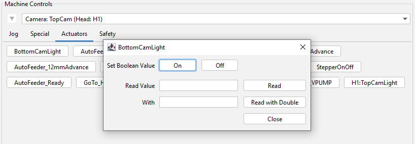 Click the BottomCamLight and H1:TopCamLight buttons respectively, and in the pop-up dialog box, control the status of the actuator with the On and Off buttons, and observe whether the corresponding camera backlight is working properly.