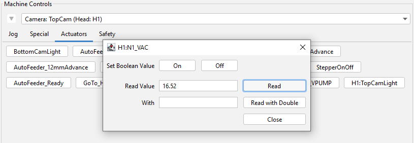 Click the Read button to get the vacuum sensor value. The vacuum sensor value is close to the real value of the negative pressure (-kPa, not very accurate, but enough to complete the function). Switching the vacuum valve on/off state should result in a significant change in the vacuum sensor value.