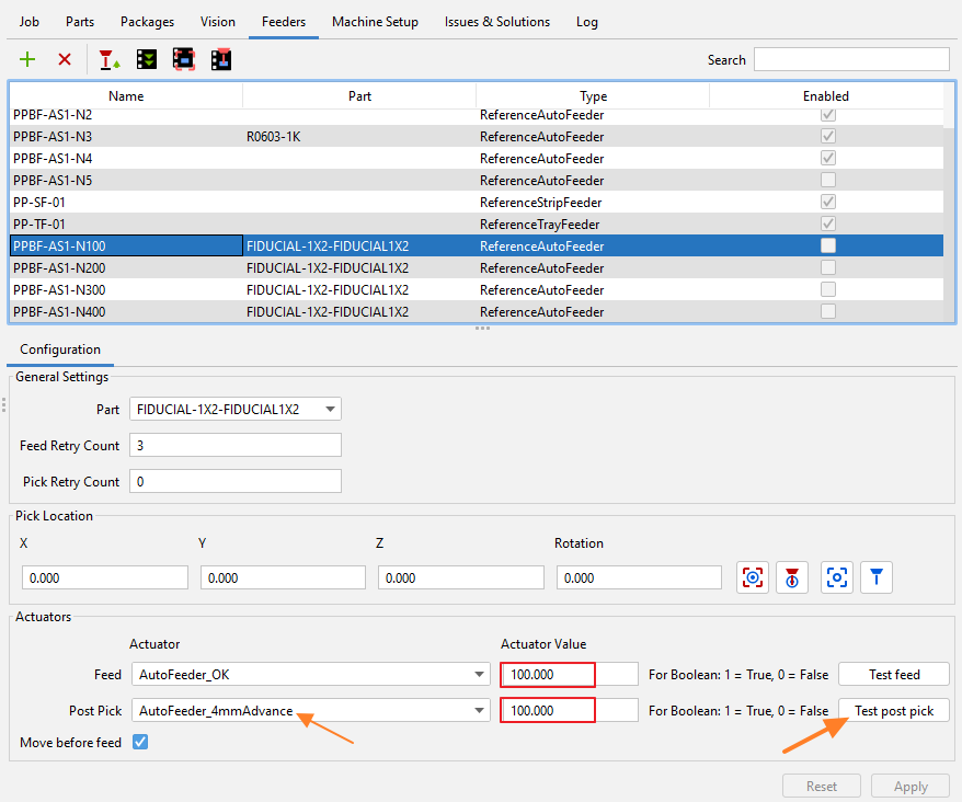 Click on the Test post pick button, if the servo/ AS2 feeder completes the corresponding movement, then the feeder system is operating properly.
