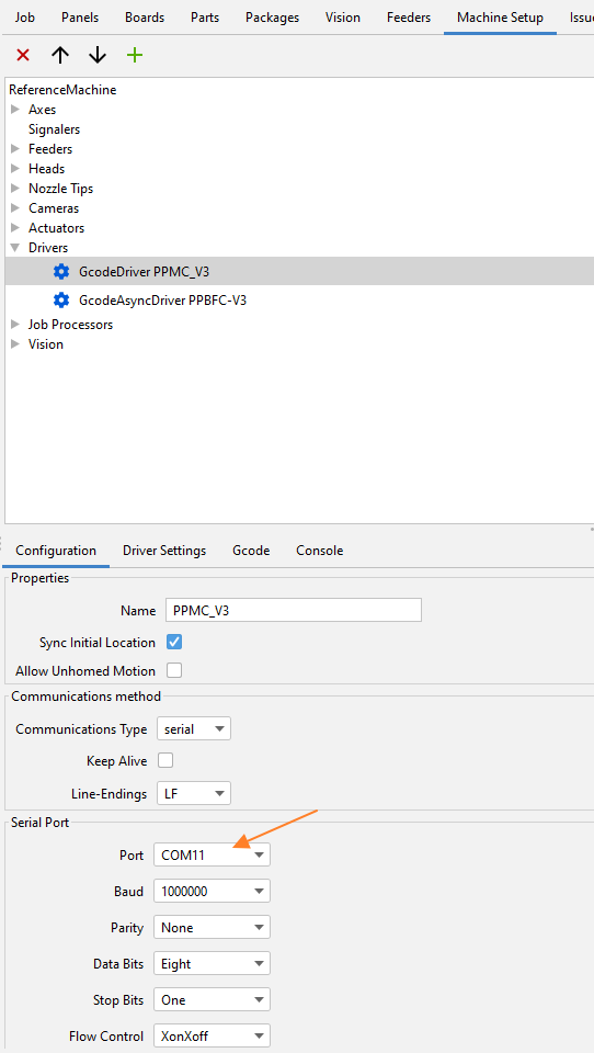 Motion Controller serial port: Machine Setup > Drivers > PPMC_V3