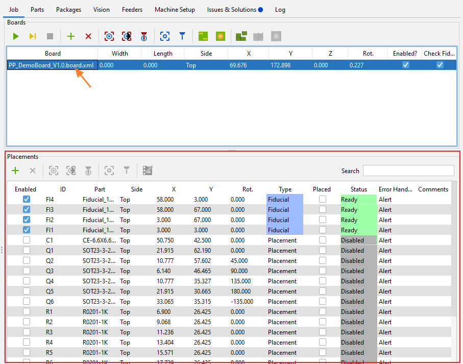 Open the Job file PP_DemoBoard_V1.0.job.xml provided by Pandaplacer